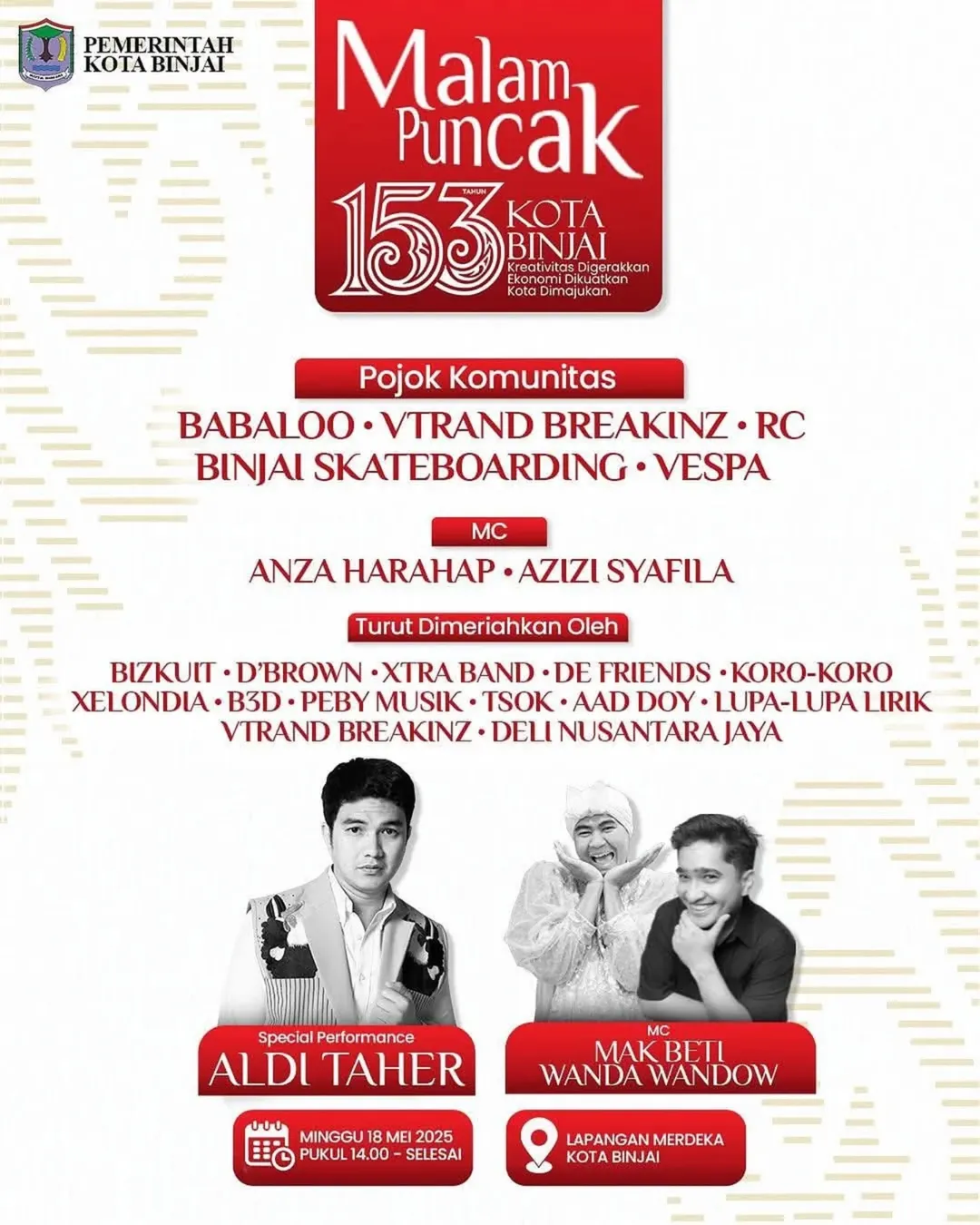 Nah Buat Warbin yang nanya-nanya mimin siapa Guest Star di Acara Hüt Binjai, Nih mimin kasih tauuu.. Akan ada penampilan dari Bang @alditaher.official dengan MC dari Mak Beti dan Bang Wandawandow.